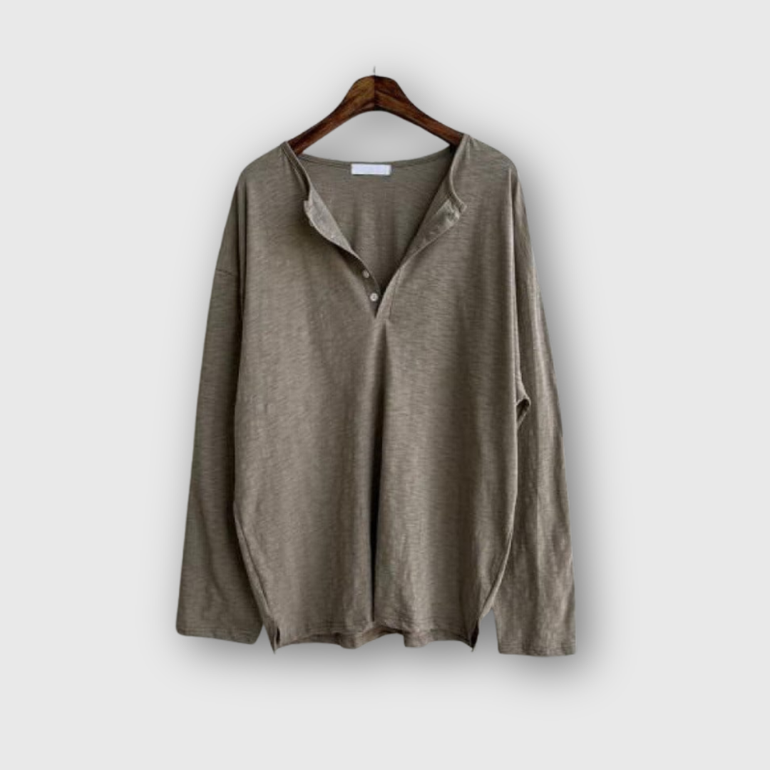 • Design: Buttoned V-neck with relaxed silhouette
